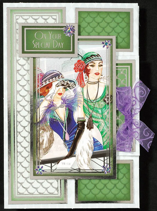 Foam tape the Lady Topper to the card front section so that it overlaps the valley fold. Foam tape the “On Your Special Day” foil greeting to the top left corner. Place Purple Flower Jewel Dazzles™ on the corners as shown. Place Teal Jewel Dazzles™ on the flower centers.
