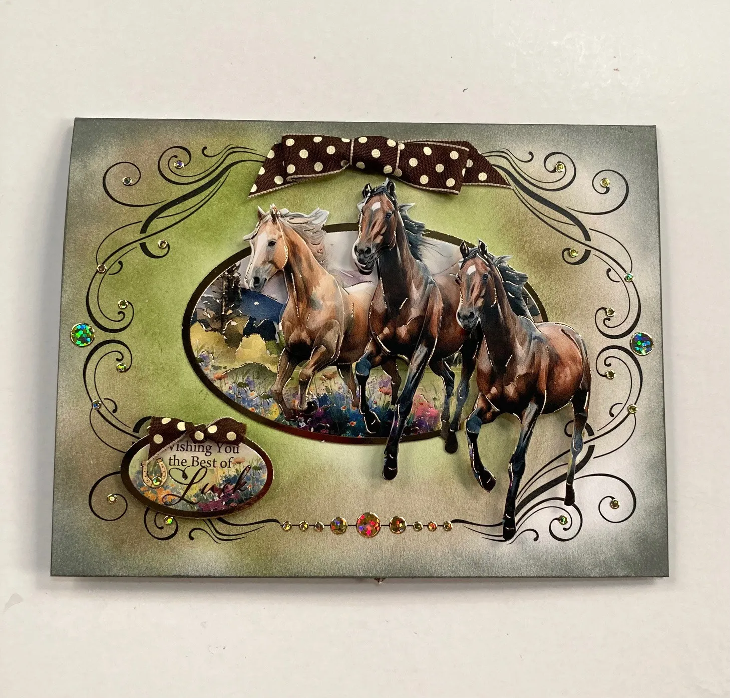 Use the In the Meadow topper set. Tape the back of the main oval Topper and adhere to the center. Save the second layer with the two horses for the inside. Finish layering piece onto the card front with foam tape. Foam tape the small Topper saying "Wishing You the best of Luck" to the lower left corner and Zot™️ a 1" knotted ribbon to the top.