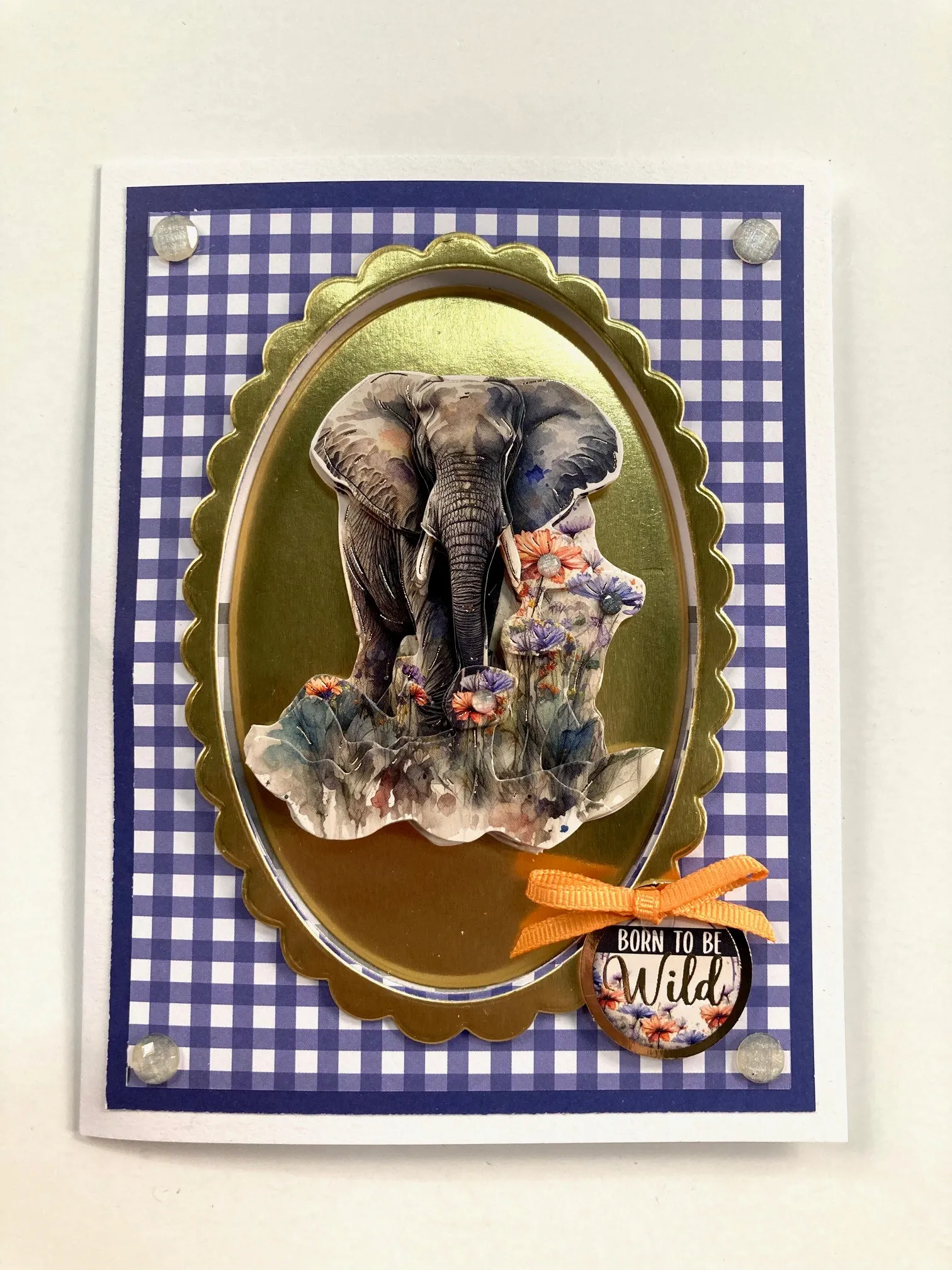 Card inside: Cut a 5"x3 1/2" solid gray cardstock and tape to the bottom of the card. Cut a 5"x3 ¼” gray gingham and tape leaving a 1/8" grey borders. Tape the gold oval centered in the evacuated area. Build the elephant in the center of the oval using foam tape. Place black script Dazzles™️ top and bottom of the oval. Zot™️ 1" peach ribbon knots as shown. Place Diamond Sparkles to the grey gingham in the corners.