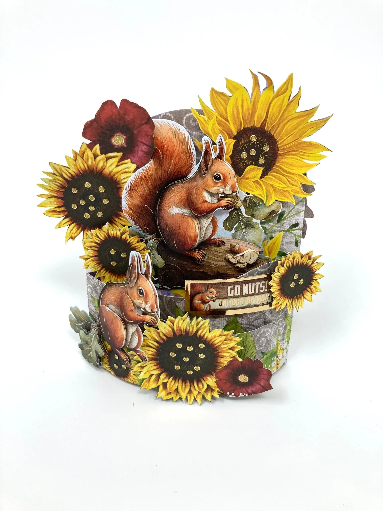 Select the Woodland Wonder Topper Sheet. Split the squirrel decoupage pieces so the main piece is on the back section so it will show when the card is close. The "Go Nuts" Topper is foam taped on the middle section and more of the squirrel is foam taped on the front section. The remaining squirrel is foam taped on the back.