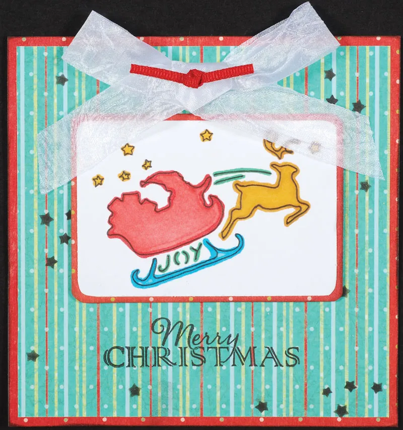 Place stencil on white cardstock and trace around outside and inside edges. Color the following shapes with colors. Santa/Sleigh: CR7, edge CR9. Sleigh blades: IB3, BT8. Reindeer: GB6, GB7. Stars: GB6. Whip and JOY: JG2. Go over traced shapes with black pen. Cut outside traced edge and mat on red paper with 1/16” borders. Ink edges black. Foam tape centered 1” from top edge.