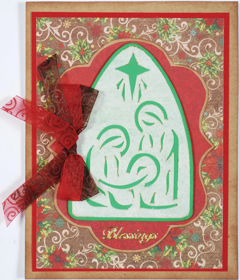 Trace the 4”x5” Vintage Label onto red swirl paper. Cut out and mat with kraft cardstock. Ink edges and glue to the card center. Place the “Blessings” Dazzles at the bottom of the label.