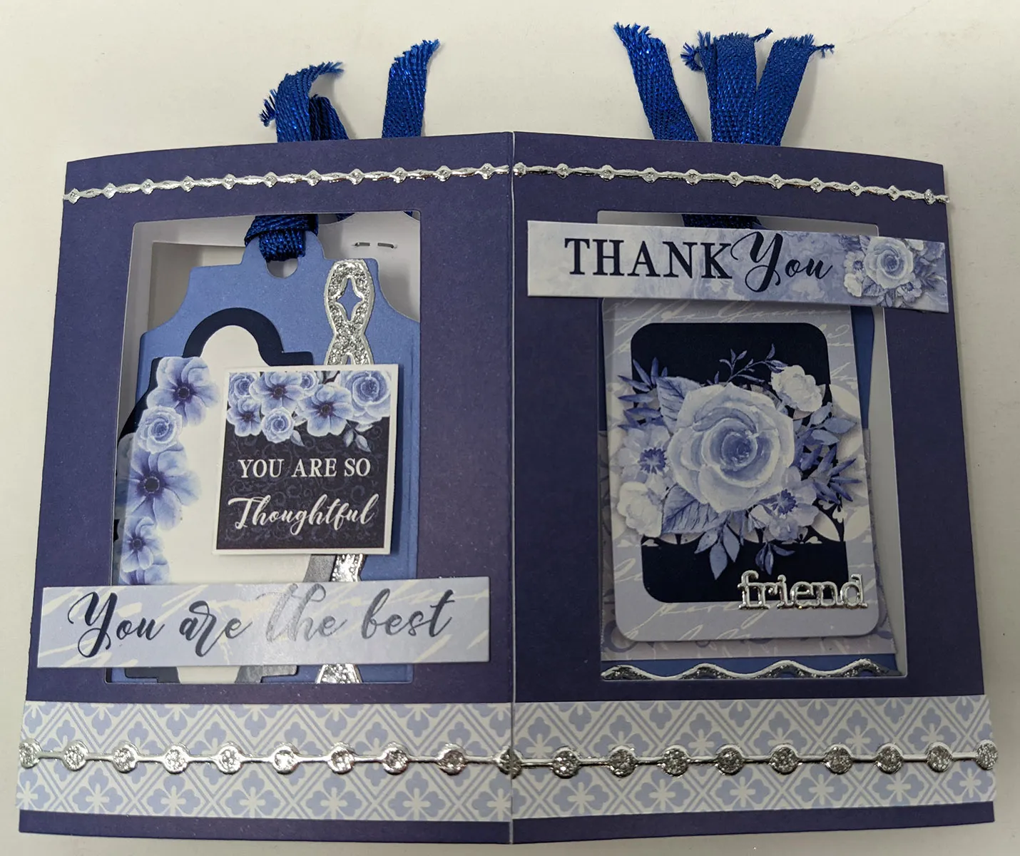 5. Complete the card construction by attaching the last tab to the inside edge at the opposite end of the card. Glue Blue Persuasion “you are the best” and “thank you” banner die-cuts across two openings as shown.