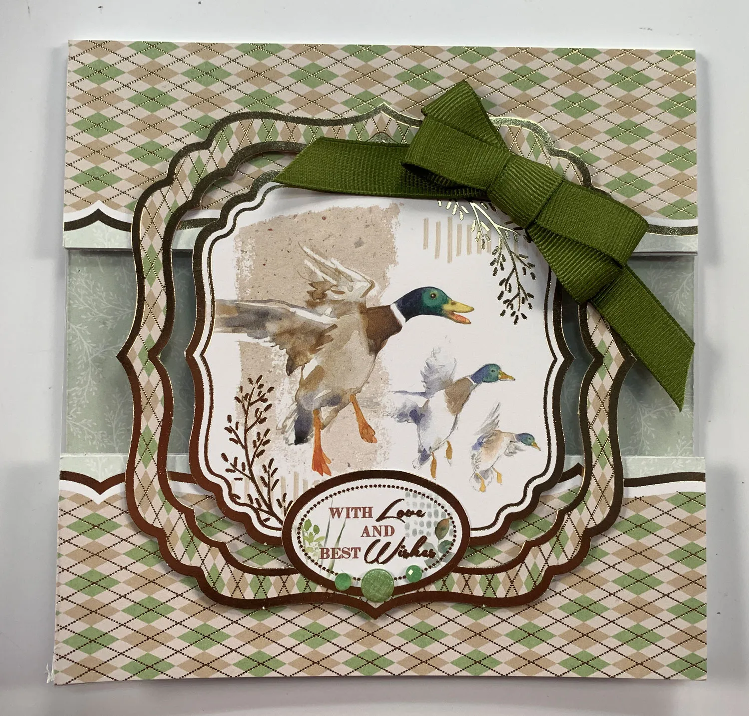 Cut 12”x6” white cardstock and fold in half placing the fold at the top. Measure and cut 2” from the fold. Use Extra Sticky Tape to attach 6”x6” acetate to the card front flap. Cut two 6”x2” foiled borders from Adorable Scorable. Use the Tape to attach each border to the card—one along the fold and the other at the bottom, leaving a clear acetate middle. Remove the Mallard die-cut Topper and separate the pieces. Foam Tape the ducks in the card center and the frame as shown. Glue the foiled sentiment, Zot™ a bow and place Diamond Sparkles as shown.