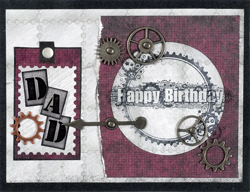 Place the card fold at the top. Cover the card with black glimmer paper. Glue a 6 ¼”x4 ¾” rectangle of sheet metal paper to the front of the card. Tear the left edge of a 4”x 4 ¼” rectangle of burgundy paper and glue a 3” circle sheet metal paper to the center. Stamp the large gear stamp onto the circle. Stamp “Happy Birthday” across the center. Secure silver gears to the top left and bottom right. Secure a large silver spinner to the lower left. Glue the torn burgundy paper to the right side of the card.