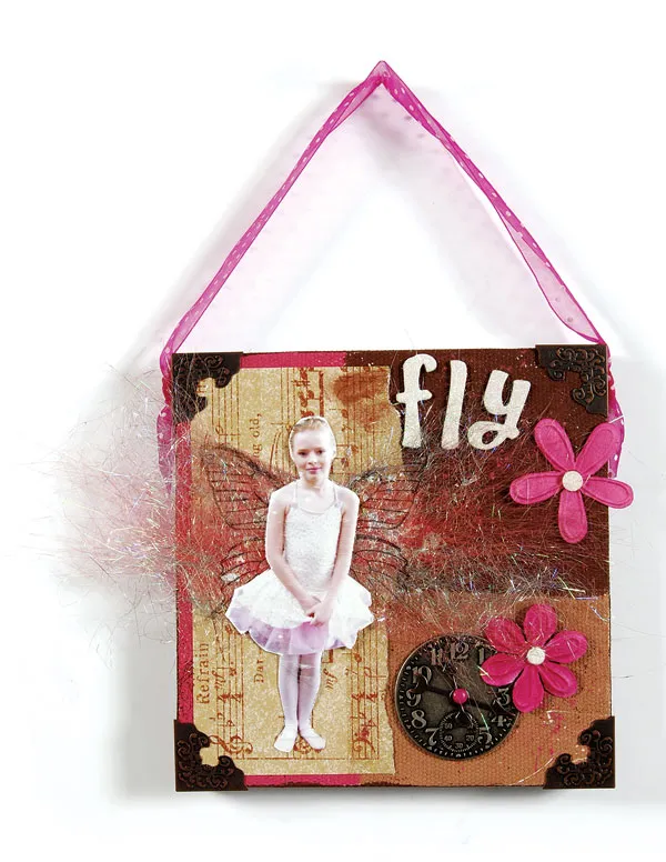 Tear the right long edge of a 2 ½” x 5 ½” rectangle of horizontal music paper. Glue the paper overlapping the pink rectangle on the canvas. Glue the metal corners to each canvas corner and let dry. Adhere “fly” letters to the top of the brown section. Knot the ends of the ribbon length and glue the knots to the left and right sides of the canvas. Let dry.
