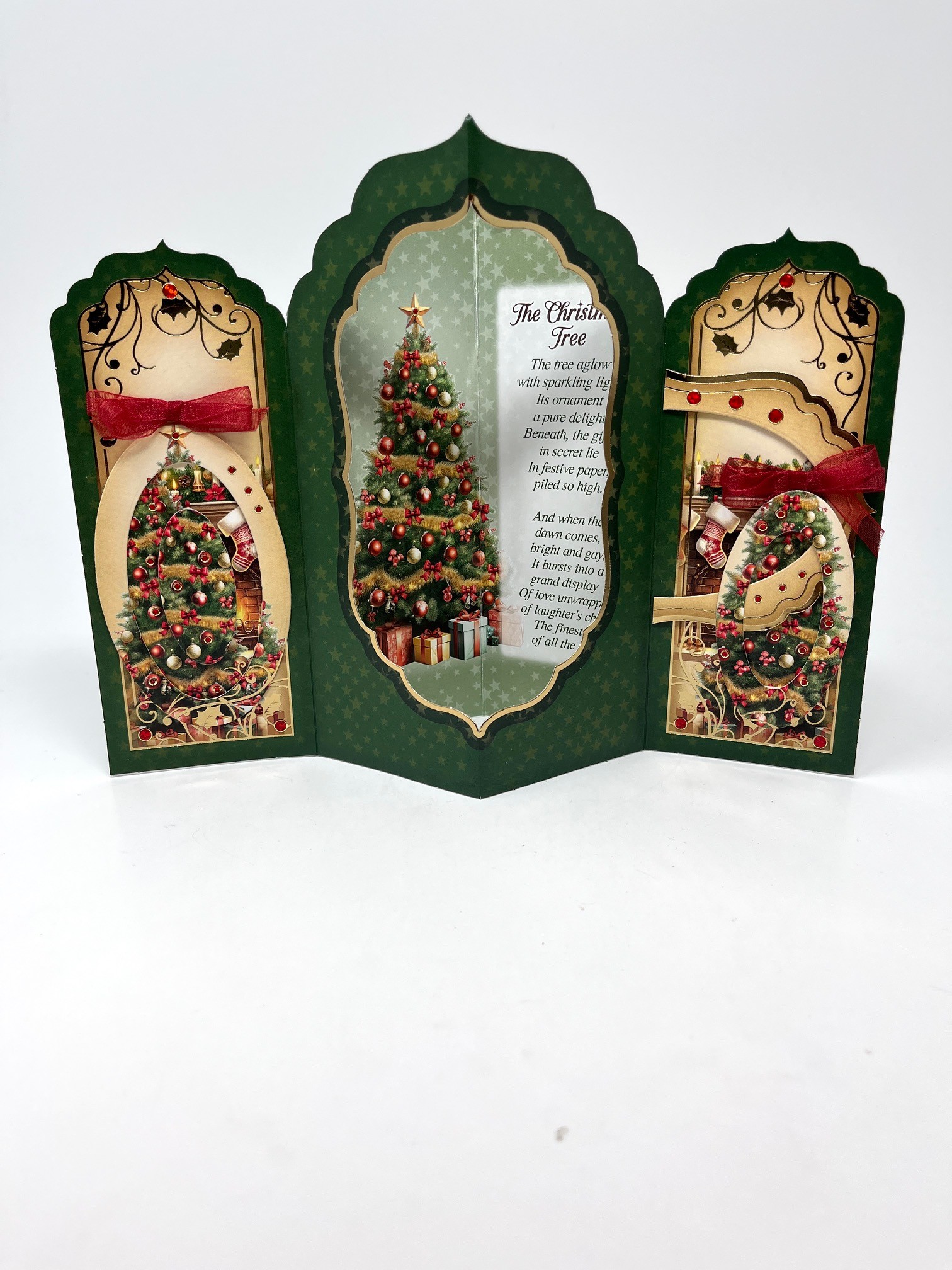 Follow included Instructions to construct tree card base using the “Christmas Classics” sheet. Using the removed tree and frame die-cuts, place the innermost three straight edge oval dies on top of the tree die-cut and run through die-cutting machine. Cut the outer frame in half—save the gold frame for another projects.