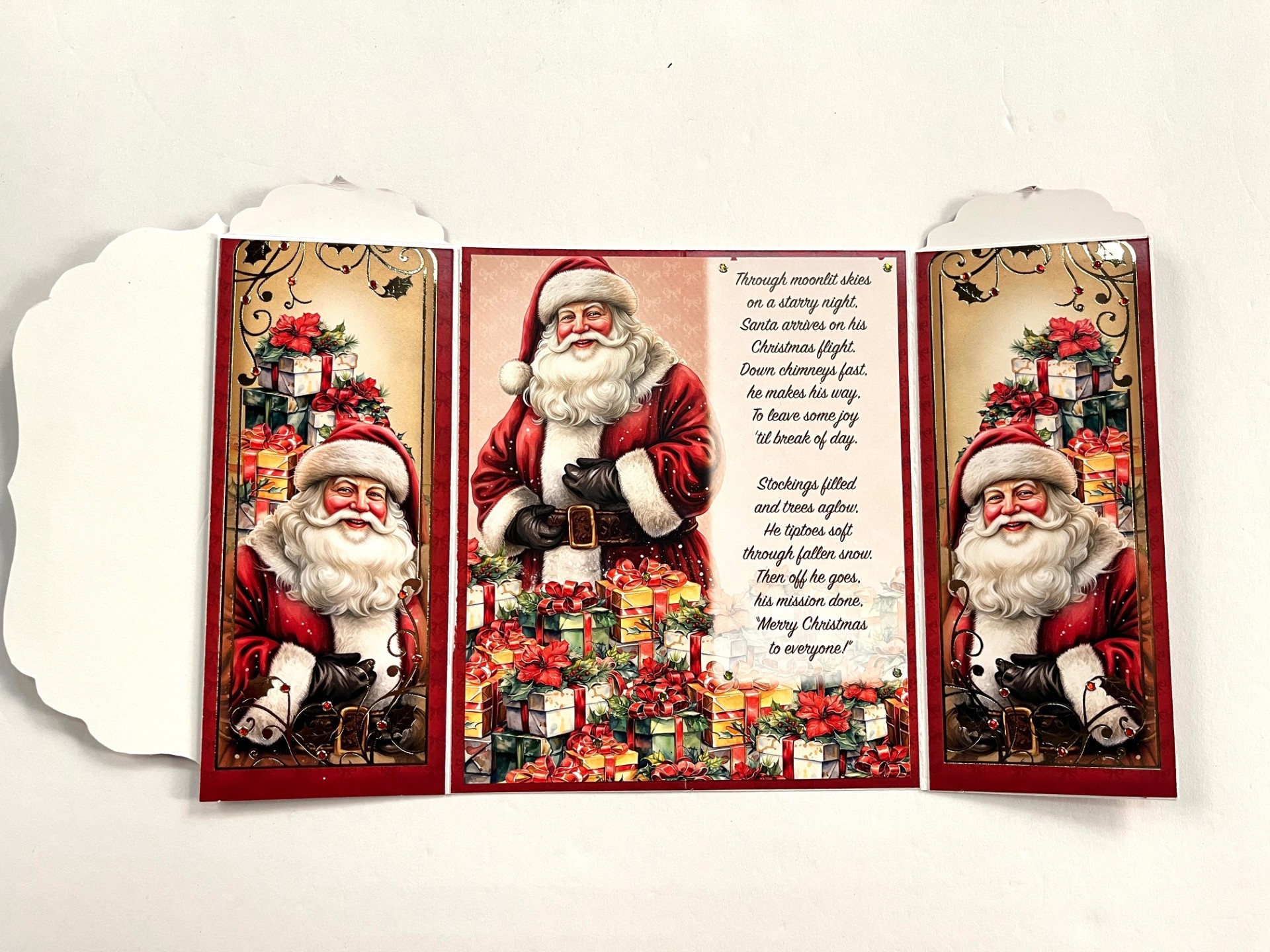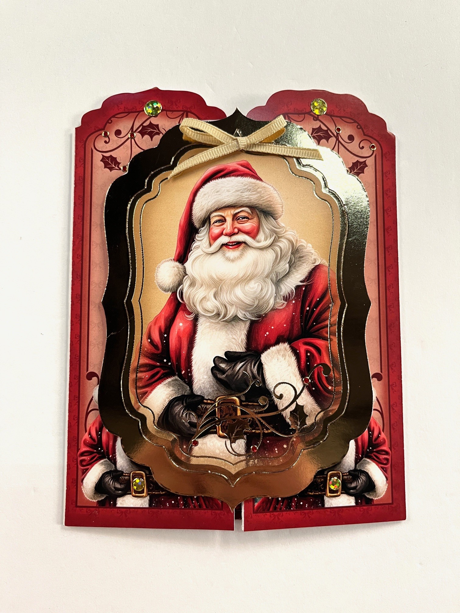 Use the not foiled Santa card base and cut off the center section to form a gatefold card. Fold the card. Remove large Santa die-cuts from the foiled card base. Foam tape the left side only to the left gate. Make and Zot™️ a 1 1/2” wide bow from the Ivory Ribbon Set and place at the top of the Santa Topper. Place Dazzles™️ as shown.