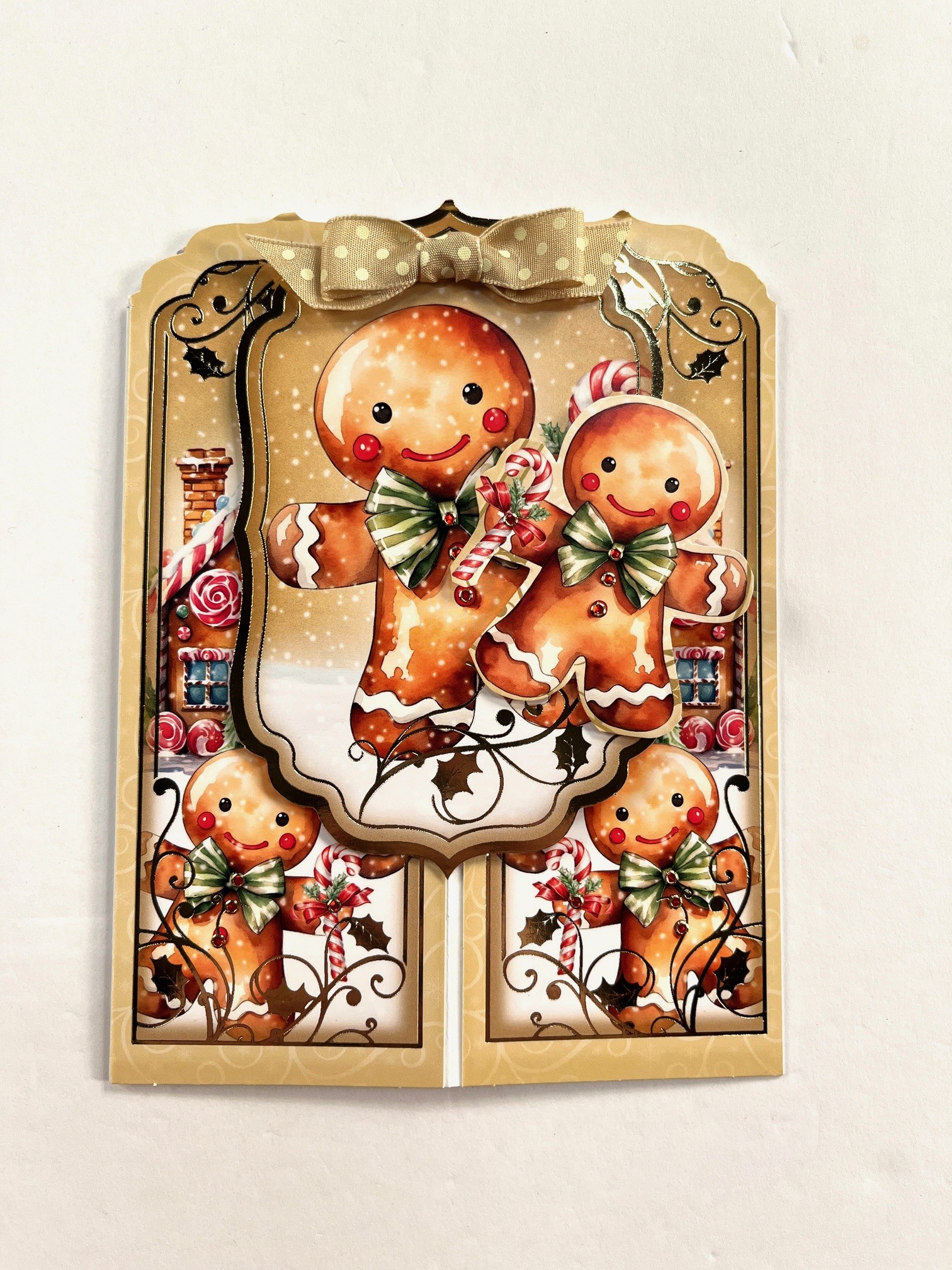 Trim off the sides from gingerbread man foiled card base and cut to 2 ½” wide but leaving scalloped tops in place. Attach to the front of a white card. Remove the inner gingerbread man die-cut from the foiled card. Foam tape in the center at the top. Trim out a small gingerbread man from the other card base and foam tape as shown. Make and Zot™️ a 2” wide bow from the Ivory Ribbon Set and place at the top of the topper. Place Dazzles™️ as shown.