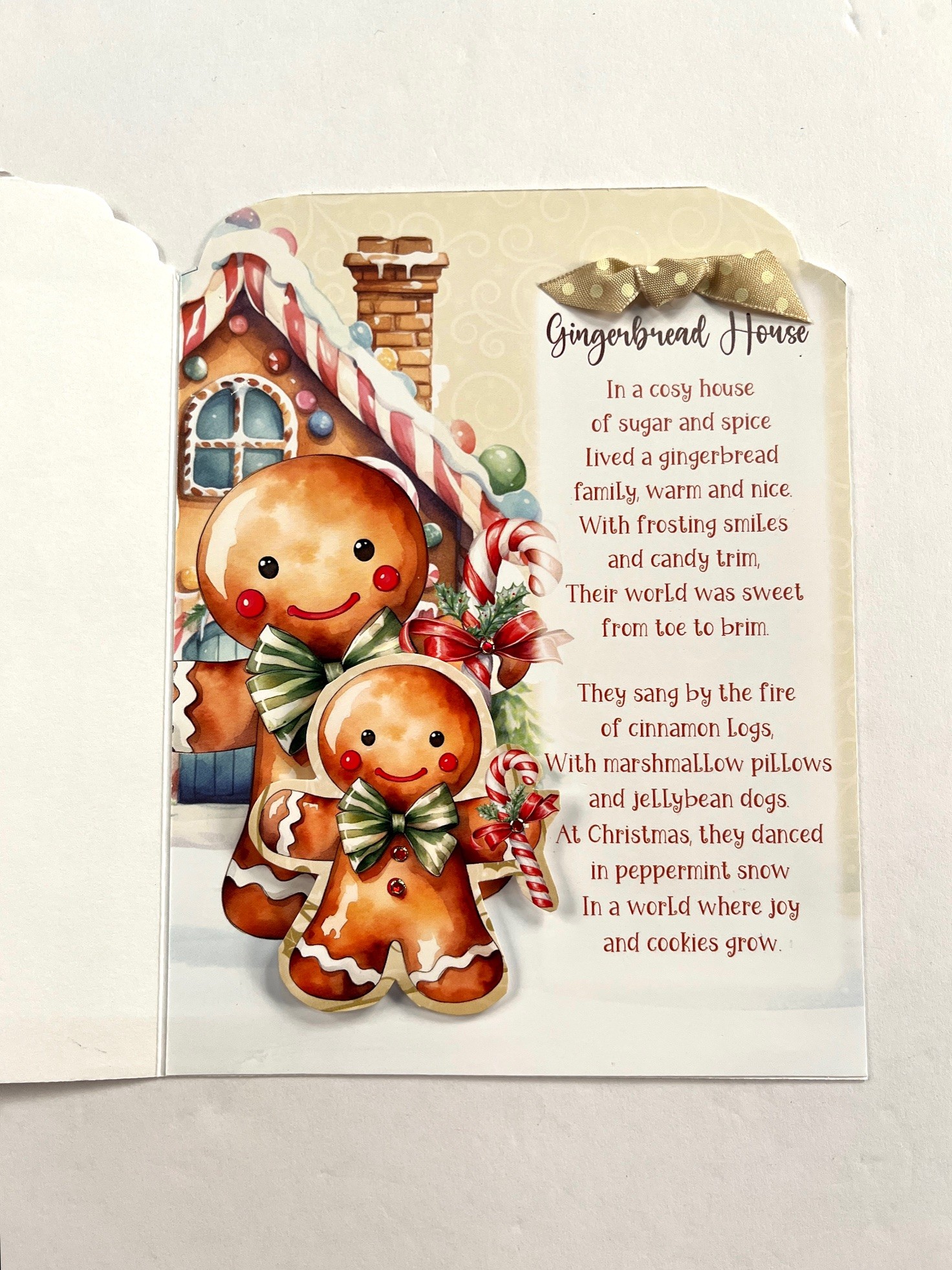 Trim the “Gingerbread House” insert to 5”x6 ½” and glue inside the card. Make and Zot™️ a 2” wide knot out of the Ivory Ribbon Set and place above the “Gingerbread House” title. Place Dazzles™️ as shown.