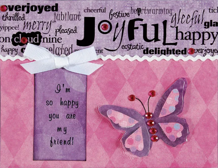 Lift up the overlay and draw antenna on the butterfly. Write on the tag and glue under the overlay to hang from the seam between the two papers. Glue the overlay to the card front around the edges. Glue crystals to antenna and to the “o’s” on the word border. Glue the rick rack to the overlay, over the seam between the 2 papers. Use the ribbon to tie a bow and glue to the overlay at the top of the tag.