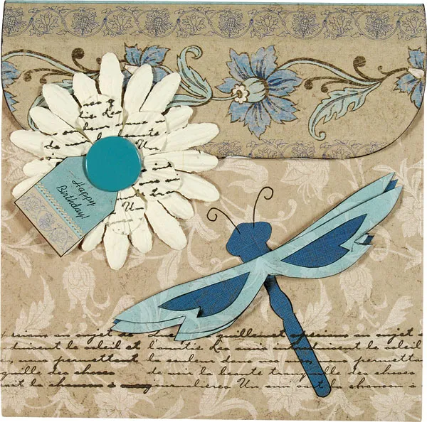 Stamp the 2” white flower with the script stamp and layer over the 3” flower. Secure the flowers to the left front of the portfolio, just below the flap edge, using the blue Great Big Brad. The flower overlapping the flap will act as the closure. Write “Happy Birthday” on a small tag and glue under the brad.