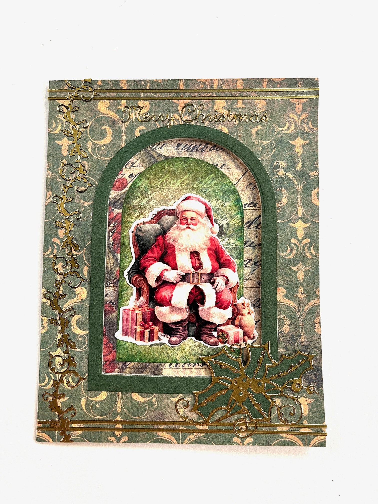 2. Use the 2 ¾” wide and next larger die to cut a frame from green Christmas Past 12x12 Solid Cardstock. Glue over the arch. Place gold straight line Dazzles™ at the top and bottom of the card making two lines of each. Place the border from the Holly Dazzles™ next to the card fold. Place “Merry Christmas” from the Tiny Words & Phrases Dazzles™ at the top.