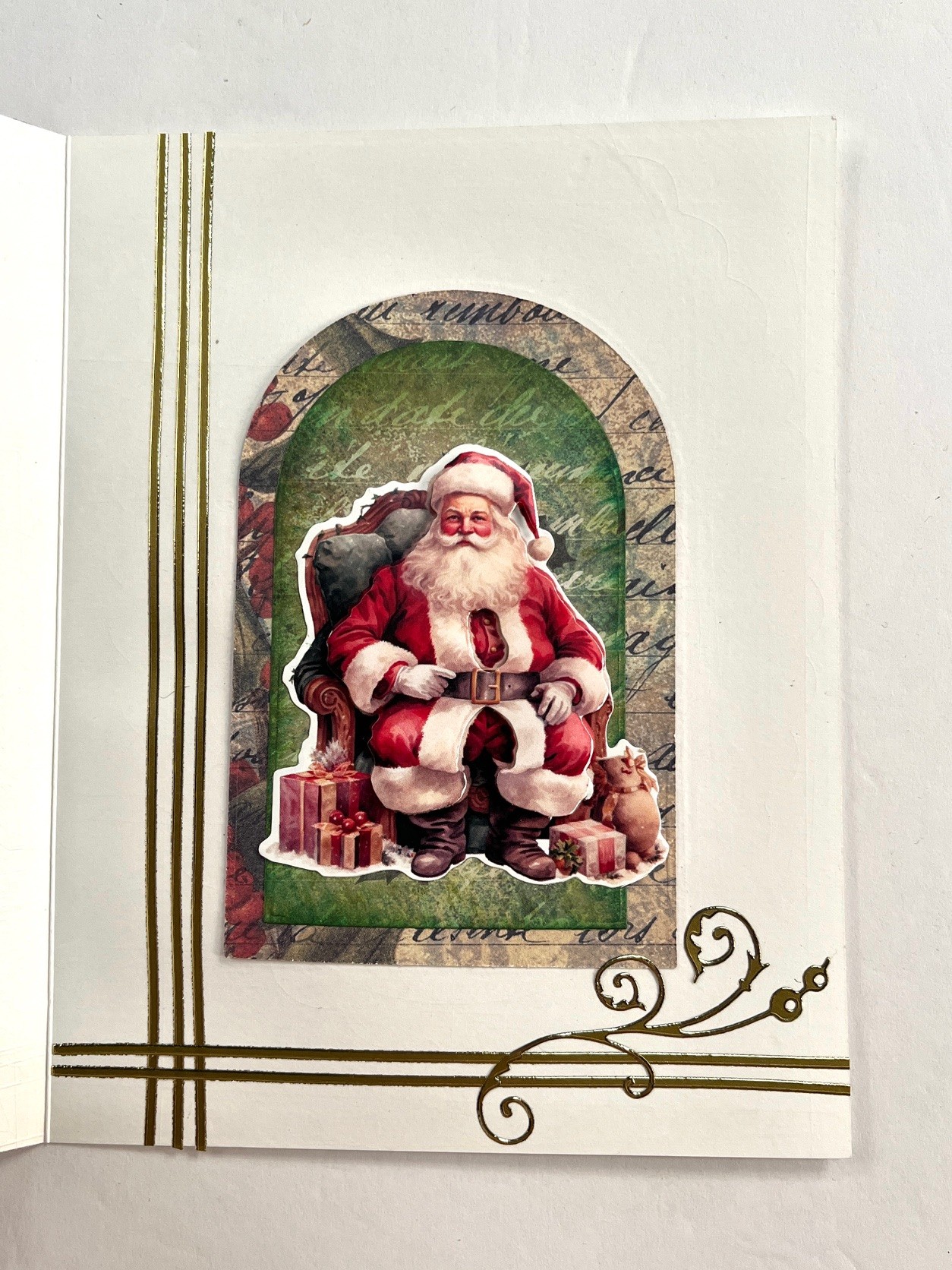 6. Glue #1 Santa Push out in the center. Foam tape Santa #4 over the matching art. Place three and two rows of gold straight line Dazzles™ as shown. Place a swirl from the holly Dazzles™ over the bottom right.