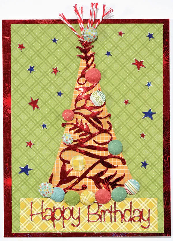 Card front: Place a blank card with the fold on your left. Cover with Red Fireworks Holographic paper. Glue a 4½”x6¼” Hopscotch green plaid paper centered.