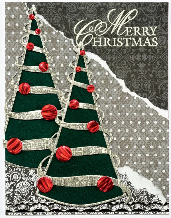 Card inside: Cover the inside of your card with Sunshine & Shadows grey/black flourishes paper. Place border Dazzles™ along the bottom as shown. Use VersaMark™ to stamp “Merry Christmas&rdquo,; dust with embossing powder, shake off the excess and set with the heat gun to emboss. Place the remaining silver tree overlay on the lower left, cutting even with the fold and the bottom edge of your card.