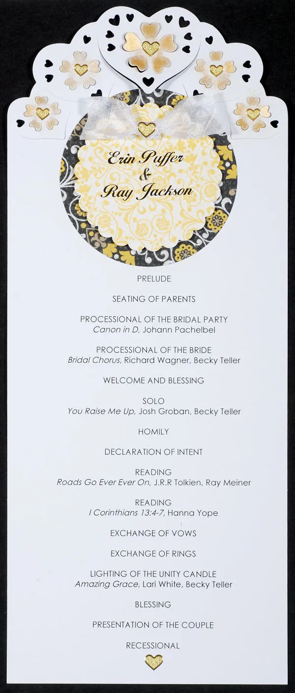 Place the program with the die-cut on the top. Computer print the wedding program so it begins 6 3/4” from the bottom edge of the card. Leave 5/8” space on the bottom edge. Pop up and punch out the die-cut hearts.