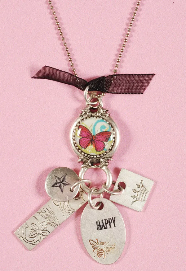Use a small butterfly from a piece of the Artful Boutique paper with the Shape studio tool and bubble cap to create an embellishment for the large round tag with inset at the center. Add foam tape to fill the center, then add the embellishment. Stamp “happy” on the oval tag with embossed bee. Stamp a small star on the center of the small round flat tag. Use pliers to assemble pieces as shown. Add chain and ribbon.