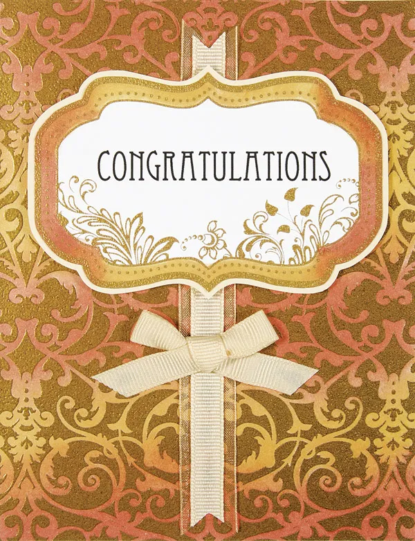 Ink the sides of the large tag with cosmic copper and galaxy gold. Print “Congratulations” on the tag and foam tap to the center of the card, ¾” from the top. Glue a small cream grosgrain bow to the card, centered, 2¼” from the bottom.