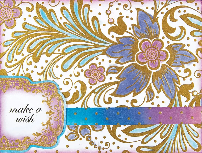 Ink the edges with orchid. Color in the flowers and flourishes with sky blue, lavender, purple and orchid, using the small tip of the inkpad for precision coloring. Wipe off excess ink with a paper towel.