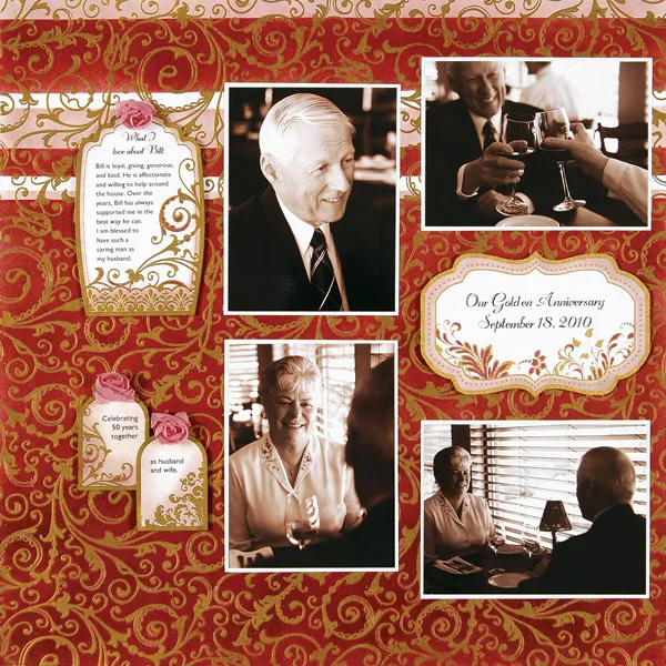 Journaling: For the left page: Cut out the two small tags, the 3 ¾” scalloped swirl tag, and the 4 1/8” scalloped label. Journal on the tags and print a title on the label. To ink the tags, use the make-up sponge and the pink inkpad. Dab the sponge onto the inkpad and rub ink onto the tag in a circular motion until you get the desired effect. Color in the details of the gold embossed designs with a burgundy marker. Foam tape the 3 ¾” scalloped tag 1 ¾” from the top and left. Foam tape one of the small tags 1 ½” from the left and 3 ¼” from the bottom. Foam tape the other small tag 2 ½” from the left and bottm. Foam tape the label ¼” from the right and 4 ½” from the top.