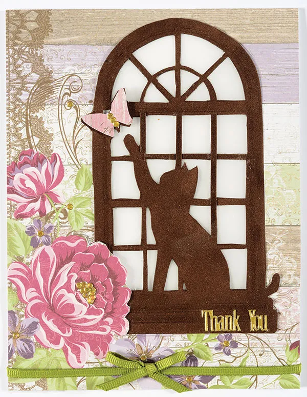 Use the embossing folder to emboss a 4”x6” brown suede paper. Cut around the outside edge. Cut away the window panes and around the cat. Place on the card front, tucking the left bottom corner under the flower, and ¼” from the top. Trace lightly around the window just to the window sill. Remove the window, and cut inside the traced lines, on the card front only. Place the window again to make sure nothing shows behind. Glue a 4½”x6” vellum on the inside of the card front. Glue the cut out window to the card front, tucking the bottom left corner under the flower.