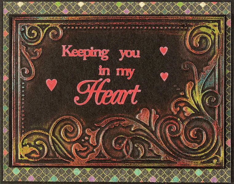 Use the embossing folder and die cutting machine to emboss a 4”x6” black cardstock. Use your finger to spread the Inka Gold paints on the raised areas. Wait a few minutes for it to dry, and buff with a paper towel. Rub red Inka Gold over the Dazzles™. Wait a few minutes and buff. Place as shown. Trim the embossing so there is a 1/8” border on the outside. Foam tape on the card front centered.