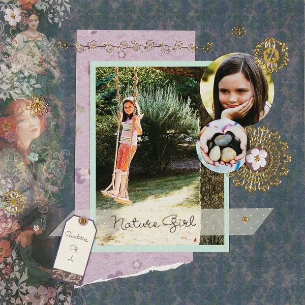 Cut a 1 ½” x 9” vellum strip and write “Nature Girl” over the strip. Secure over the bottom of the 5”x7” photo using gold mini brads (TIP: place printed journaling under vellum and trace with a pen for perfect journaling every time!) Write on a tag and secure to the right of the vellum strip.