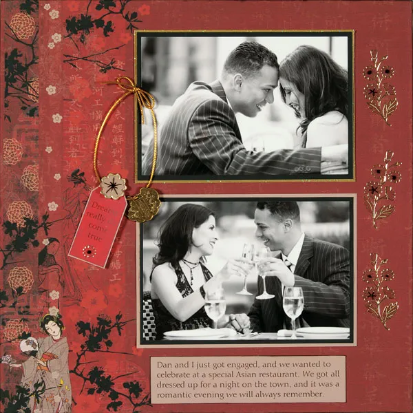 Turn the red Asian background paper with the wider border so the border is at the left side. Ink the edges. Mat the two 4" x 6" photos on black cardstock leaving a 1/8" border. Mat one again on gold glitter paper leaving a 1/16" border, and the other on tan cardstock, leaving a 1/8" border. Glue to the right side of the background paper, 1 3/4" from the right side, and 7/8" from the top, leaving 3/8" between the photos.