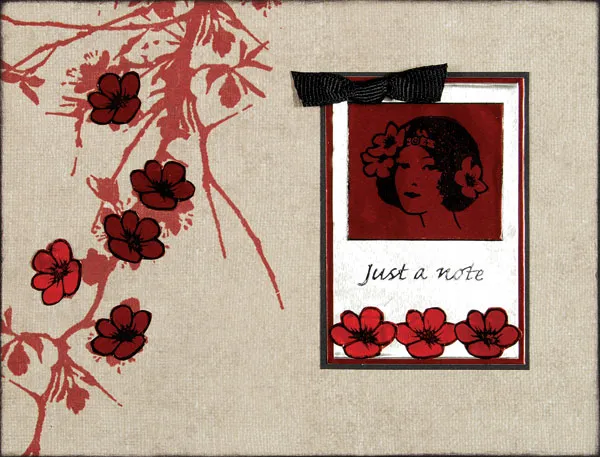 Stamp the flower image 10 times on red metal. Let dry then cut them out. Attach 3 red flowers across the bottom of the silver matting beneath "just a note", plus add 5 flowers to the border design at the left side of the card. Zot knotted ribbon at top of lady image as shown.