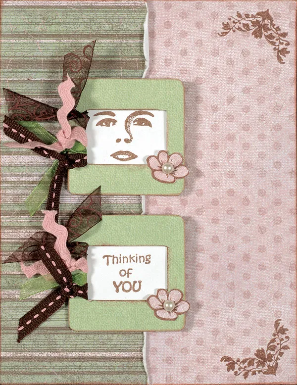 Place the card with the fold on the left. Cover the right side with pink dot paper and the left with green/brown/pink stripes with a torn edge. Stamp a flower corner at the top and bottom right edge. Roll the torn edge with your fingertips.