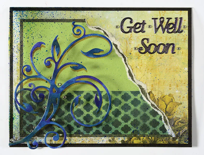 Use the die-cutting machine to cut the viney swirl from light colored scrap cardstock. Follow the E-Brush instructions to spray the die-cut with blue and green Spectrum Noir pens, then set aside for later. Use EZ Dots to place the scrap cardstock with the evacuated viney swirl cutout over the left side of 5 ½”x4” green pastel cardstock, then spray with green. Die-cut a fancy lattice from scrap cardstock, cut down the center for two long lattice strips, then use EZ Dots to place on the bottom 1 ½” of your green cardstock. Cover the top of the cardstock with scrap paper and spray with blue and grey. Remove the lattice die-cuts, then spray a bit more over the lattice area. Tear off the right side of the cardstock, as shown. Mat on dark music paper with a 1/8” border, and tear on the right. Glue ¼” from the left, top and bottom edges of your card base.