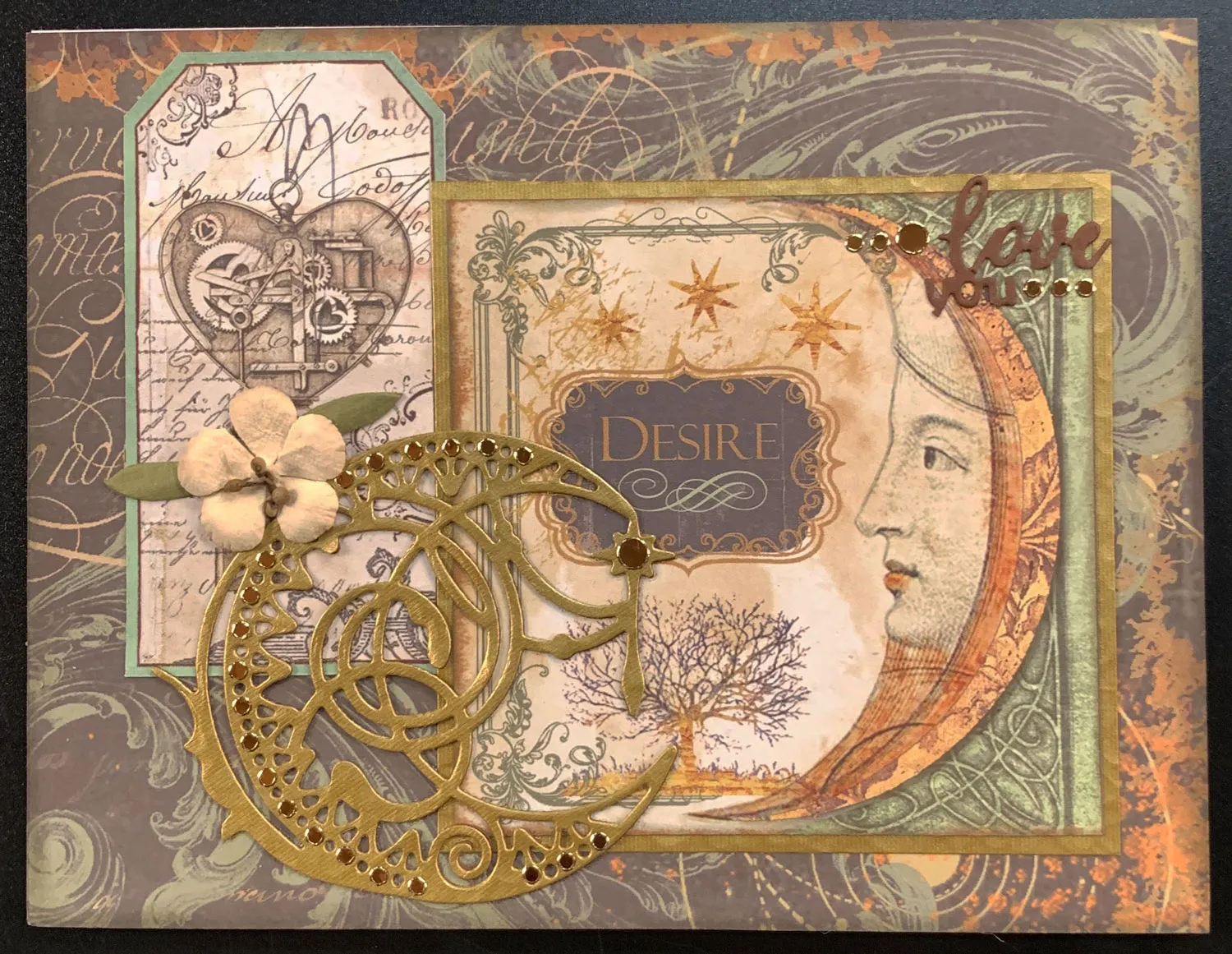 For the card front: Place the card with the fold at the top. Cut 6½"x5" Alchemy brown/teal paper, ink the edges, and glue it to the card front. Cut out the 1¾"x3½" Alchemy heart key tag. Cut out the Alchemy 3½"x3½" Desire label, ink the edges, and mat it on Hammered Gold paper with 1/8" borders.