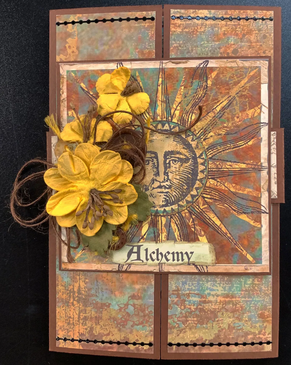 Cut two 3 7/8"x1 1/8" Alchemy ivory/brown script papers and glue them centered on the front and back bellyband panels. Cut out the 3½"x3½" Alchemy sun panel and mat it on cardstock with 1/16" borders. Glue it centered on the bellyband front.