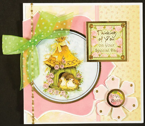Cut the card to 5” square and place the fold on the left. Cut Hunkydory pink/yellow border paper to 4 3/4” square and glue to the card center with the border on the right. Trace the Design Tool Kit #4 Elegant Label onto Azalea Suede Paper. Mat with white cardstock, leaving 1/16” border and glue even with the card fold. Glue the large birdhouse circle from Amongst the Roses die-cut sheet.
