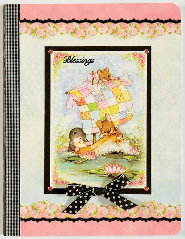 Glue 1” wide strips of Azalea Suede Paper to the top and bottom of the composition book cover. Glue 8 1/4” wide Hunkydory blue/pink rose border cardstock across the center of the book cover and trim even with the right edge. Place lengths of Black Jewel Border Dazzles™ across the top and bottom edge of the cardstock. Place a length of Black Gingham Fabric Tape down the center of the front book binding. Trim even with the binding edges.