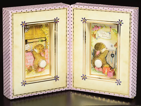 Punch out the rectangle bunny art and layer with foam tape and pieces from Patchwork Present Decoupage die-cut sheet. Ultra Tape the folded sections around the edges of the art, forming a box shape with the folded tabs folded outwards. Ultra tape the tabs to the inside back of the lavender dot box window with the. Fold and tape the box top and bottom closed. Leave the flap on the right edge open. Repeat for the second box, from Dotty Gift 2 die-cut sheet, with the side flap opened on the left side.