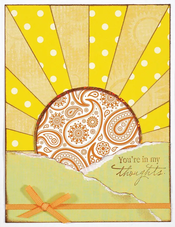 Ink the edges of the saved rays, cut to 2” long and glue five rays under the sun, as shown. Stamp “Get well soon!” with scrolls and Zot™ on a knot of ribbon.
