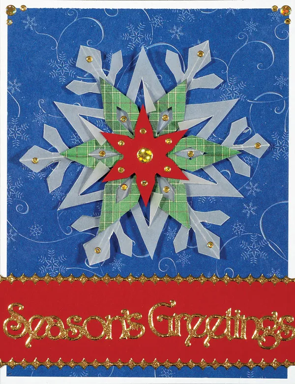 Trace and cut Dasher Layer 1 from plain Vellum paper and glue to the card center above the greeting. Trace and cut Dasher Layer 2 from green plaid paper and foam tape to the center of the first snowflake. Trace and cut Dasher Layer 3 from red cardstock and foam tape to the snowflake center. Embellish snowflake layers with Gold Jewel Dazzles™.