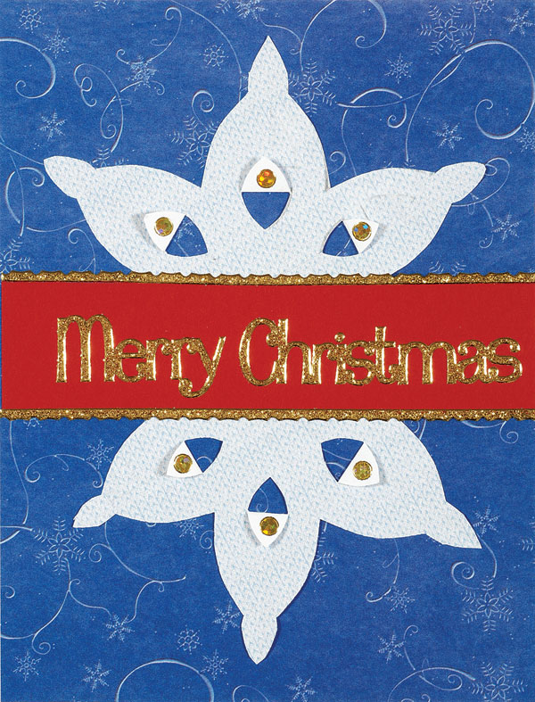 Inside: Cover the card with Blue Snowflakes & Swirls paper. Glue 1 1/4” red cardstock strip across the card and place Merry Merry Dazzles™ Gold Glitter “Merry Christmas” centered on the red border. Trace and cut Donner Layer 1 from light blue Stitched Christmas Trees paper and cut the snowflake in half. Glue each half above and below the red border. Place Gold Jewel Dazzles™ Border along the top and bottom edges of the red border.