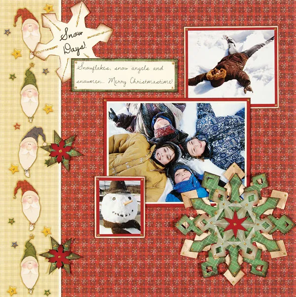 Start with Santa Plaid paper as your background. Mat a 3 1/2”x3” photo on red cardstock with a 1/8” border, then on natural cardstock with a 1/16” border. Mat a 5 1/2”x4” photo on natural cardstock with a 1/16” border, then on red cardstock with a 1/8” border. Ink the edges of each matted photo and glue as shown. Mat a 1 1/2”x2” photo on red cardstock with a 1/8” border, then on natural cardstock with a 1/8” border, ink the edges and foam tape as shown.