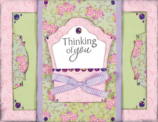 Trace the Art Deco Pocket onto pink swirls paper, cut out twice and ink the edges. Glue back to back and then assemble the pocket with Zots™. Place small Purple Jewel Dazzles™ as shown. Cut five large Purple Jewel Dazzles™ in half and place on the top edge of the pocket flap. Trim the excess and foam tape to the center of the card. Tie 7” lavender gingham ribbon in a bow and Zot™ to the center of the pocket flap.