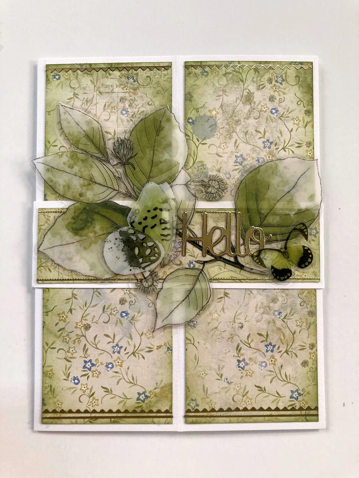 2. For the inside: Cut two darker green and two lighter green 2¼"x6¼" cardstocks and ink all the edges. Glue the darker cardstocks to the two inner panels and the lighter cardstocks centered on the outer panels. Transfer various rub-ons to all the panels, concentrating on the upper and lower 1½" on the panels. Place gold thin line Dazzles™ near the upper and lower edges of the panels, trimming the excess.