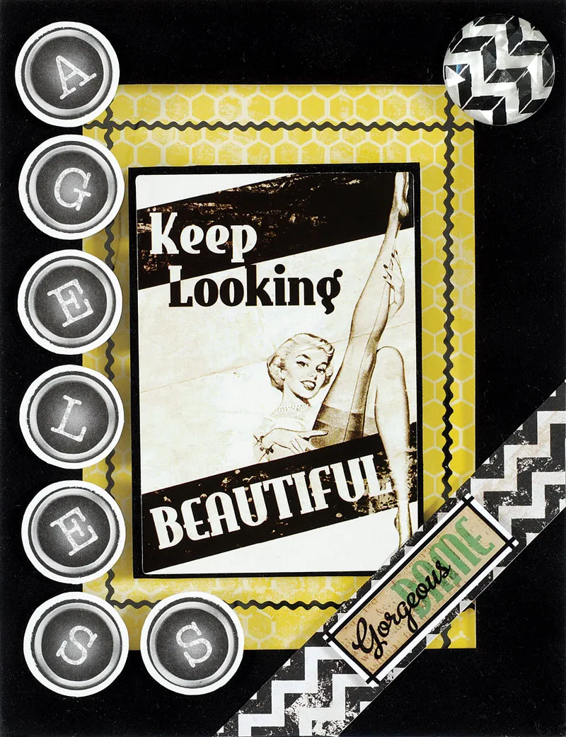 Close card and place with fold on the left. Mat the “Keep Looking Beautiful” title sticker on suede with 1/16” border, and center on the window. Cut out two sets of the letters “AGELESS” from alphabet paper and put one set aside. Mat one set on saved cardstock with 1/16” borders. Foam tape down left side and around bottom corner of window. Place 5”x 3/4” zigzag paper at an angle, 2” from corner and trim ends. Mat the “Gorgeous Dame” puffy word on white with 1/16” border. Place straight thin line Dazzles™ around word and foam tape to zigzag strip. Place zigzag rhinestone on upper right corner.