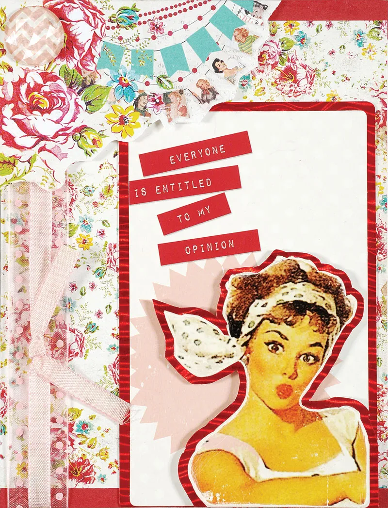 Place your card with the fold on the left. Place two 5”x1/2” red papers at top and bottom. Center 5”x6” rose paper on card. Place “Everyone is Entitled…” label on cutting mat. Using X-acto® knife, cut carefully around girl. Mat girl on red ripple with 1/8” border. Mat rest of label on red ripple with 1/8” border. Place label at bottom edge, 1/8” from right edge. Foam tape Girl over label.