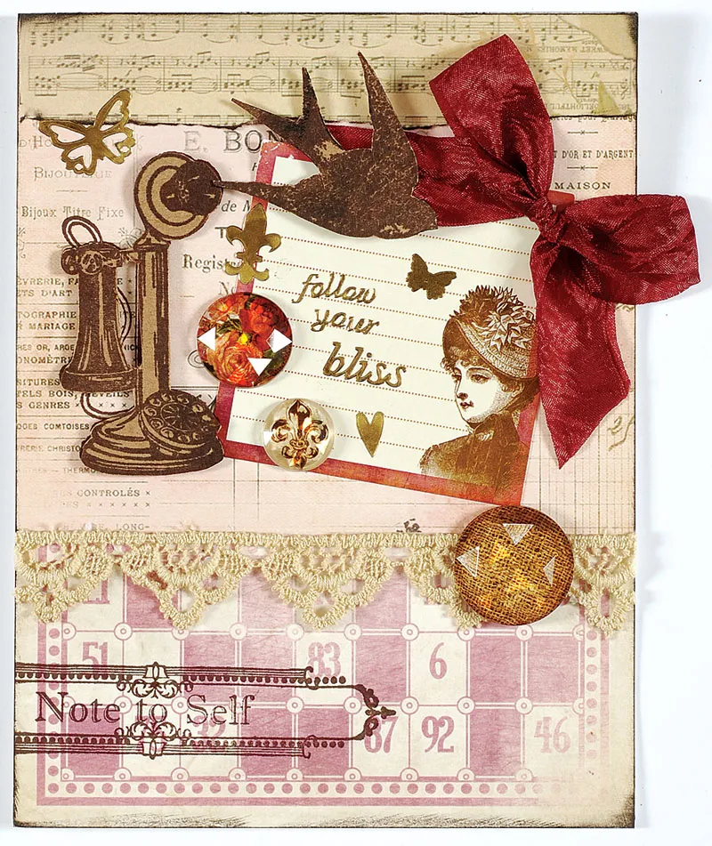 Place the square “Lady” sticker at an angle on the right and stamp the old telephone on the right. Zot™ a burgundy bow to the top right corner of the sticker.