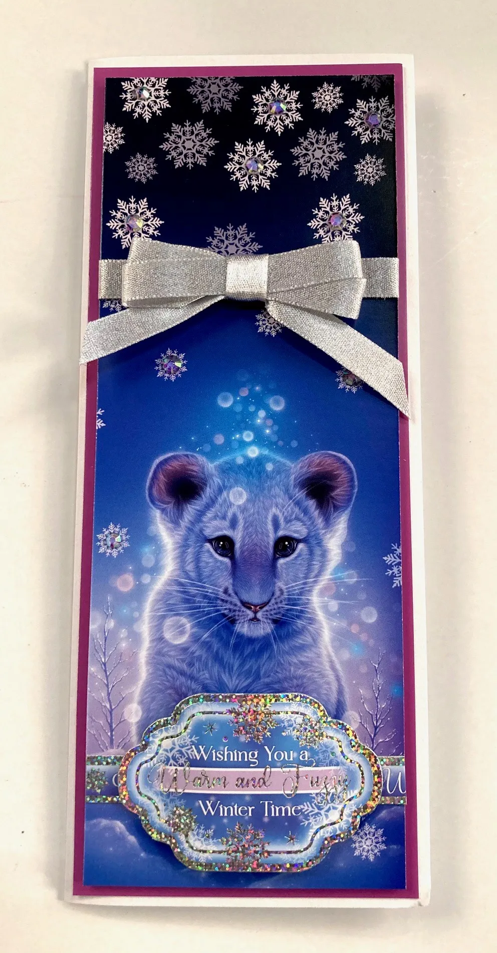Cut orchid Adorable Scorable to 8 1/4"x3 1/4" and glue to the card front. Cut a piece of printed Adorable scorable from the "Lion Cub Christmas" Collection to 3"x8". Wrap ribbon 2" from the top and Zot™️ to the back. Foam tape to front leaving a 1/8" orchid border. Zot™️ a 2 1/4" bow to the ribbon. Glue Crystalz to some of the snowflakes.