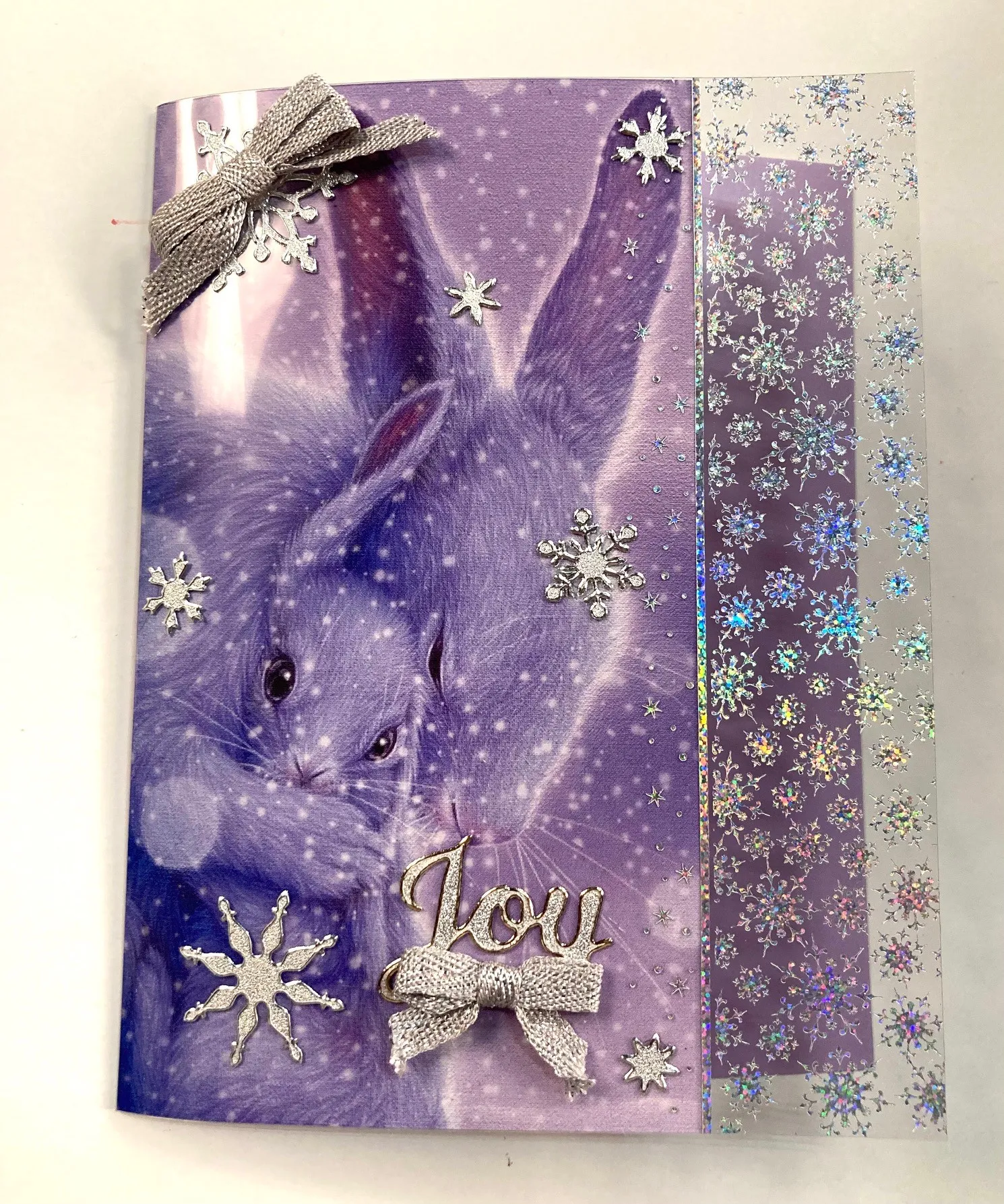 Cut 5”x6 ½” of lavender Adorable Scorable for the card base. Cut 5 1/2"x6 1/2" of the snowflake border acetate. Place horizontally and make a score ½” on the short side. Cut 3 5/8"x6 1/2" of the bunnies sheet from the 8"x8" paper pad. Place Zots™️ at various spots on the image and attach to the acetate. Use Extra Sticky Tape to attach the acetate to the back of the lavender.