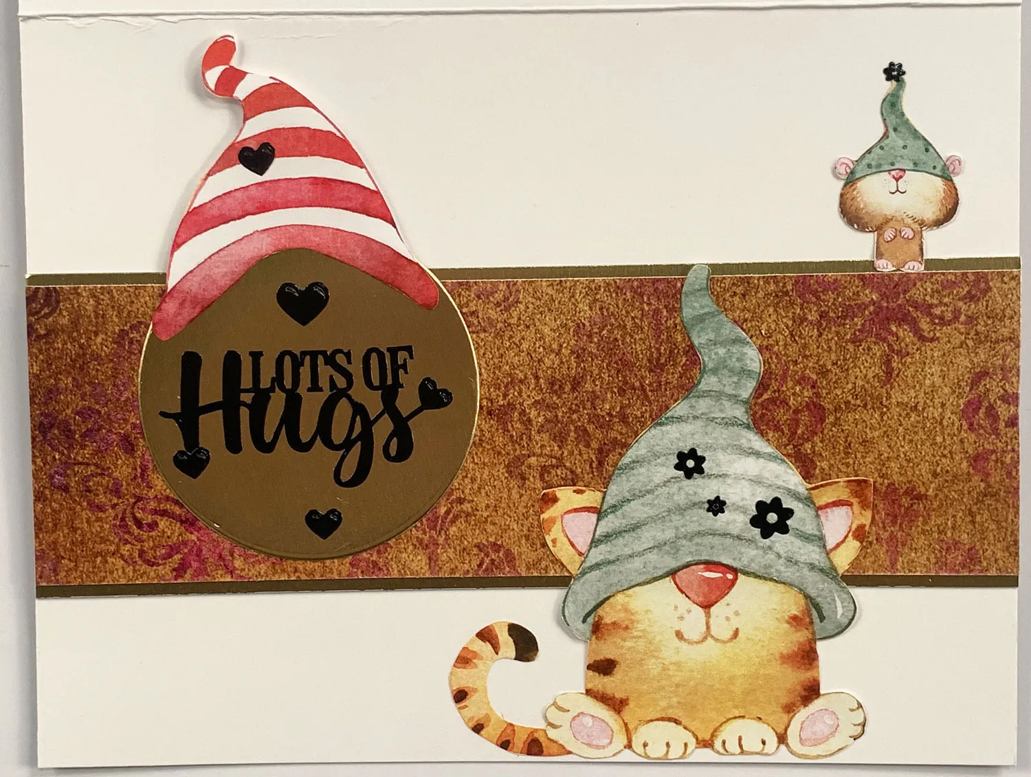 For the card use brown Adorable Scorable Dazzling Damask and cut to 10"x6 1/2". Score at the center and fold. Turn the card horizontally with the fold on top. Select the cat and dog Gnome pages. Mat one sheet to the gold metallic cardstock leaving a 1/8" gold border. Foam tape centered on the card front. Cut out just the gnomes from a duplicate sheet and foam tape over the original. Cut out the hats and paws then foam tape to the matching art. Place flowers Dazzles™️ as shown.
