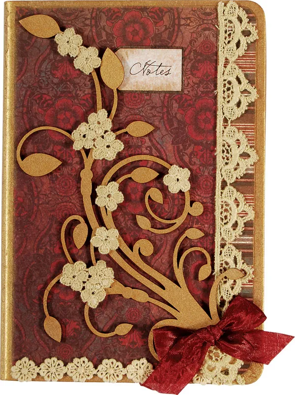 Ink the outside of the binder with copper ink and let dry. Cut a 4 3/4"x7” brown/red flowers and flourishes paper. Cut a 3/4"x7” striped paper strip and glue even with the left edge. Round the upper and lower right corners with the Corner Chomper. Glue the paper centered on the front of the inked binder. Ink the flourish wood cut-out with copper ink and let dry. Write or computer print “Notes” on tan textured paper (from the bordered sheet) and trim into a tag shape. Mat on brown patterned paper leaving a 1/16” border. Ink edges with copper ink.